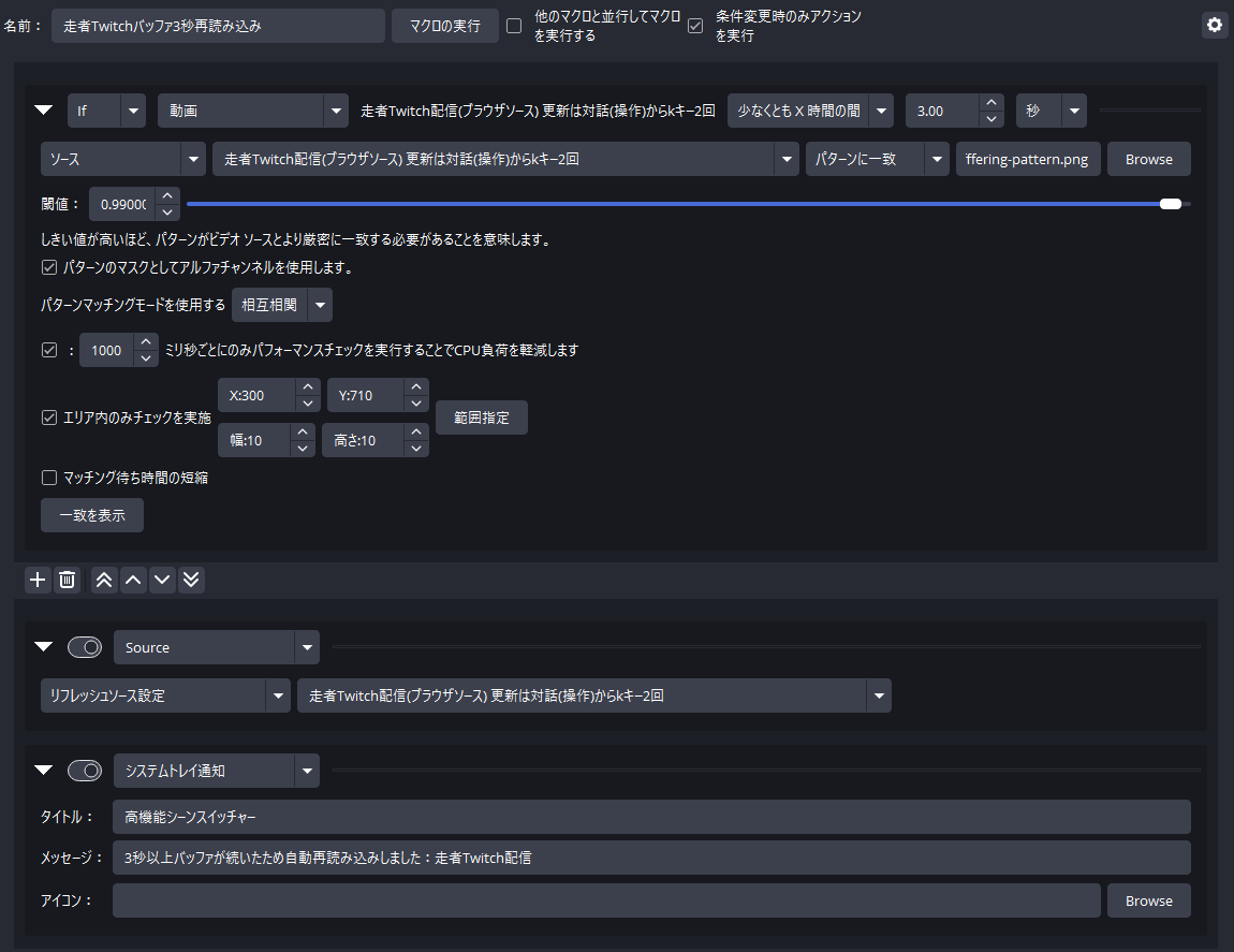 #2000,#3000エラーに対しては、高機能シーンスイッチャープラグインの画像認識機能によってエラー画面を検出することで自動更新がかかるようにした。バッファリングに対しては、バッファリング発生時に表示されるスピナーの表示をカスタムCSSで弄ることで画像認識を可能とし、バッファリングが3秒以上続くと自動更新がかかるようにしていた。