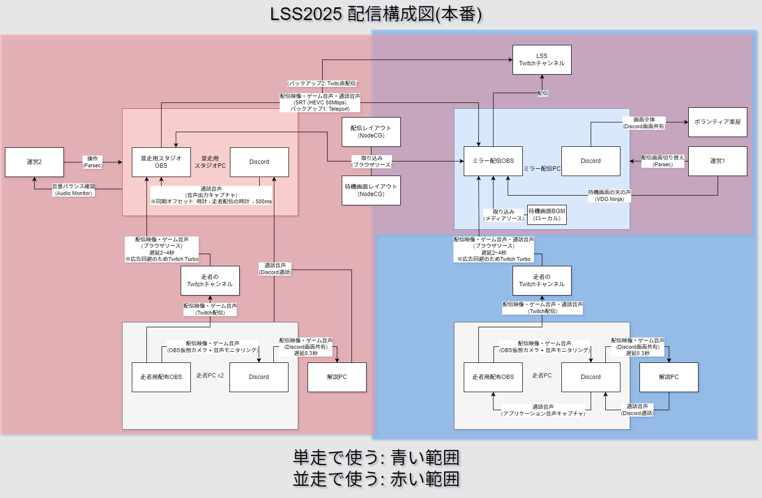 とか言っているがオンラインRTAイベントではむしろ昔からミラー配信が一般的なのだが、LSSは運営の負担を抑える(実際に抑えれているかどうかは諸説あり)ために走者にストリームキーを配布して各自直接配信してもらうという形をとっていた。しかしこの方式は作品切り替え時に視聴環境によっては手動で更新をかける必要があったり、LSS2024途中からプレロール広告が表示されるようになったりしたため、LSS2025では重い腰を上げてミラー配信方式に切り替えることとした。配信構成図は下記の通り。並走でない限りミラー配信側で音量調整を行わない点がいびつな感がある。