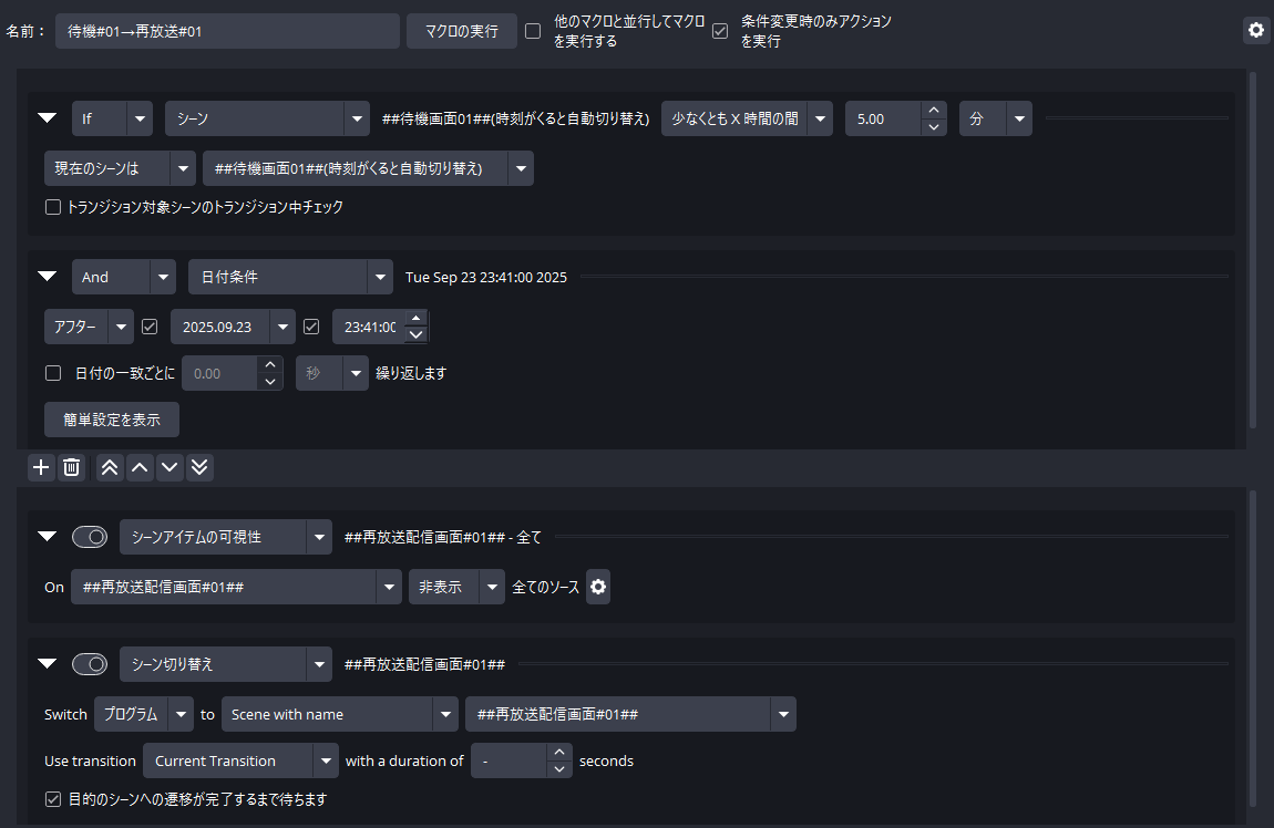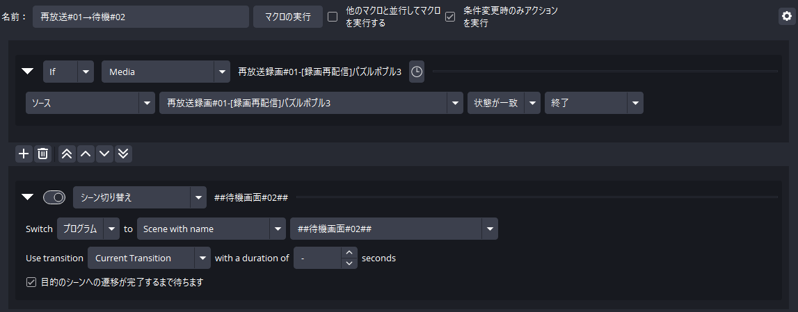 高機能シーンスイッチャープラグインのマクロでどうにかした。待機画面シーンでは5分以上待機するか再生予定時刻になると再放送シーンへ切り替え、再放送シーンでは録画の再生が終了すると次の待機画面シーンへ切り替え、を繰り返す。ひとつの録画につきふたつのマクロを設定しているためマクロがやたら多くなるが、録画と録画の間でしっかり待機画面に切り替えるにはこうしないといけなさそうな感じ。