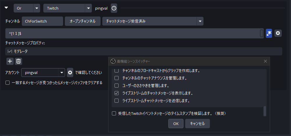 並走で解説者がゲーム音声を切り替える仕組みがあれば、解説者の意図するゲーム音声に最小のラグで切り替えることができ、しかも配信管理の仕事を減らせるのでなんとかならんかなーと思って高機能シーンスイッチャープラグインの機能一覧を眺めていた。するとTwitchのチャットをトリガーに設定できるのに気付いたため当初の予定にはなかったが並走用OBSに組み込んでみた。要求するTwitchアカウントのトークン権限は「ライブストリームのチャットメッセージを表示します」だけでok。
